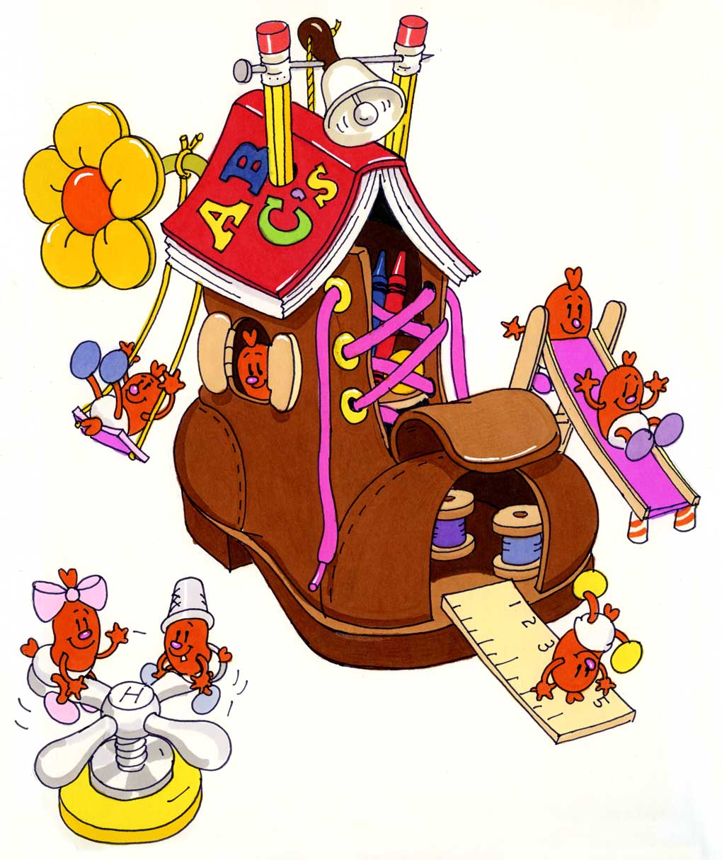 Here is an early an early suggestion for a shoe shaped building. I see Andy’s notes on the side. What should this become? A school? A large house? An Orphanage? Oh, a Nursery School! I scribbled in a teacher, who never became a character, and another school house variation. In the end, both were combined and Wilhemina became the teacher.