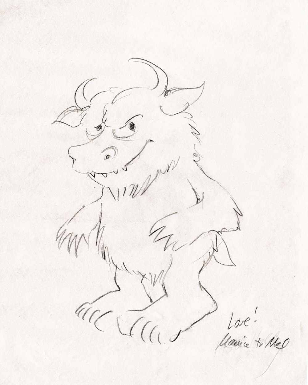 All the while that this was going on, Maurice was merrily doing sketches. Much to my chagrin, Bonnie promptly acquisitioned these, claiming she needed his originals for reference. Meanwhile, she made me this crappy Xerox copy.