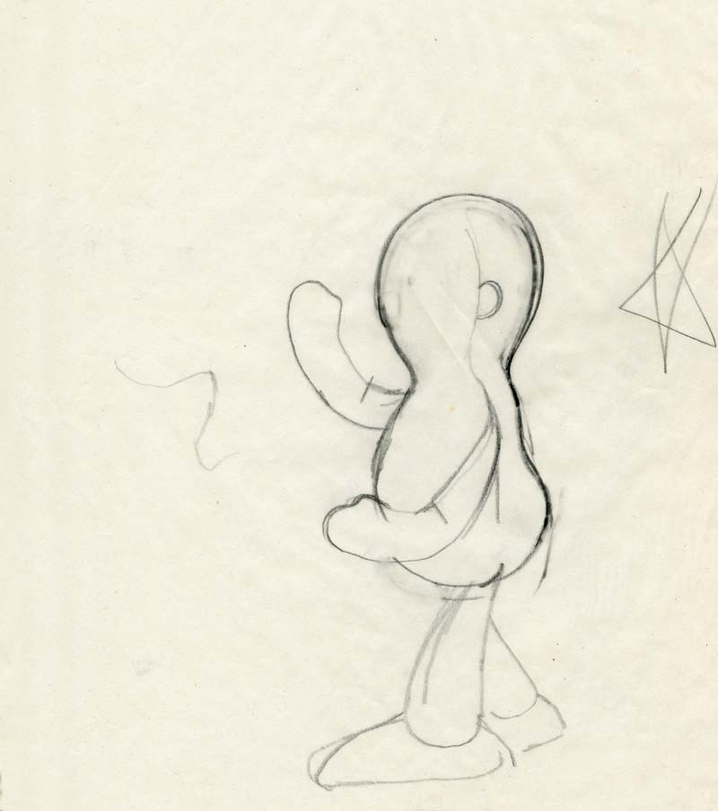 Whatever his size, the same amount of labor would be required, and his being larger would offer more perceived value. His face, we all decided would be better rendered flat, rather than splitting it down the middle. And his nose would be a plastic button. In the original drawings, I had given Max the least attention. Now, I quickly sketched the variation.