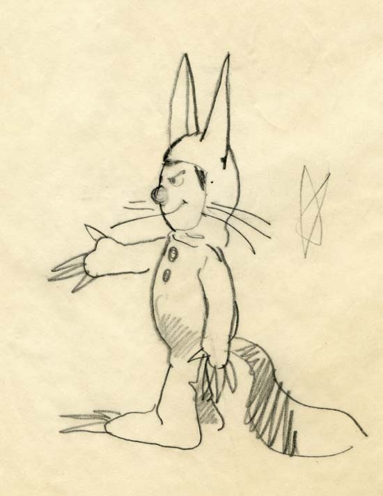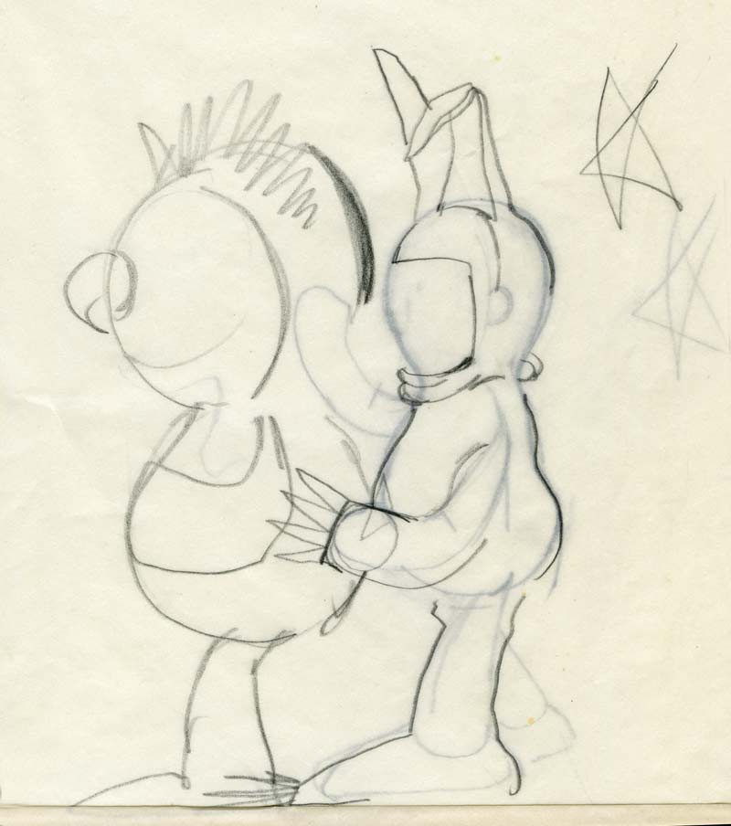 These were exciting days. Maurice and I met with Bonnie and her crew of craftsmen several times, in her studio in Manhattan. Each time, a lavish lunch was offered. The first visit was to get acquainted and discuss the dolls, their construction, and the various fabrics that would be required. At this point, we made some important decisions. I had visualized Max as being smaller than the Wild Things, as he appears in the book. Now, his size was debated, and we unanimously agreed that it would be better merchandising to make him nearly the same size as the others, so, all the dolls could sell for the same price. This sketch and overlay, done on the spot, struck everybody as “spot on!” The stars indicate unanimous approval.