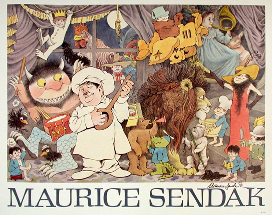 That was easy! I was able to decide, right there and then. It would be called “The Art of Maurice Sendak,” if one were to give it a descriptive name. And it would show whatever characters he chose to include, representing those from a variety of his books, together in a single scene, again, of his choosing. I added that I realized that such a request represented a major statement by him, so, to ease the selfishness factor on my part, I suggested that he allow his publisher to publish it, so he could reap the financial benefits, and the world could see it. Then, give the piece of art to me. Maurice agreed, and set about creating it, enthusiastically.