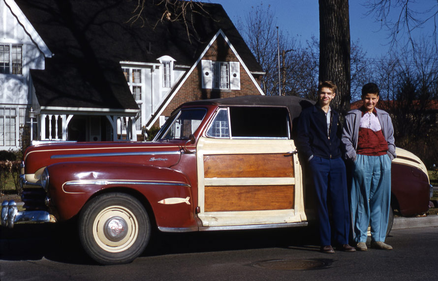 Here are Ed and Bucky, three years after this story took place; the year was 1954, out in front of my house on Seven MIle Road. The car, with wood grain siding, was Ed’s pride and joy.