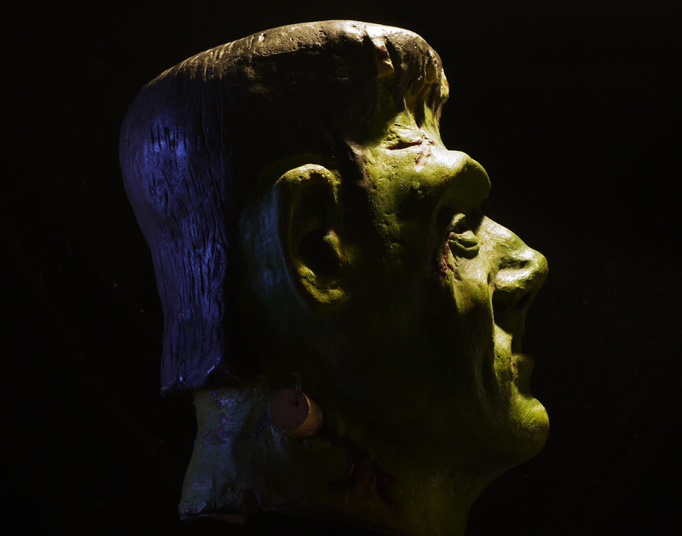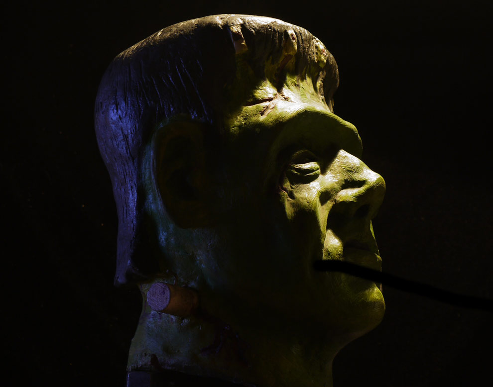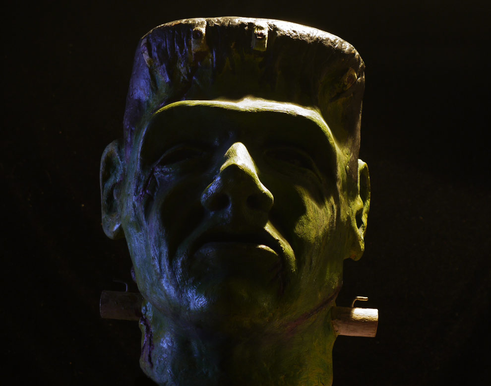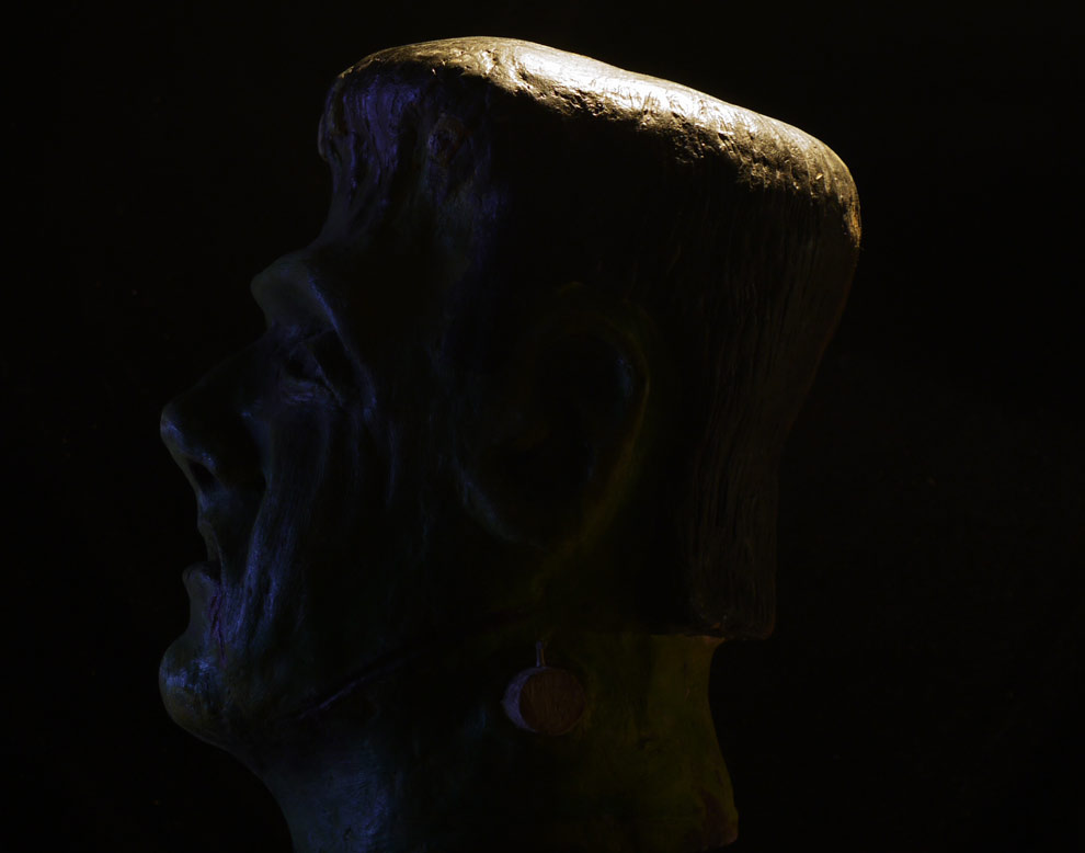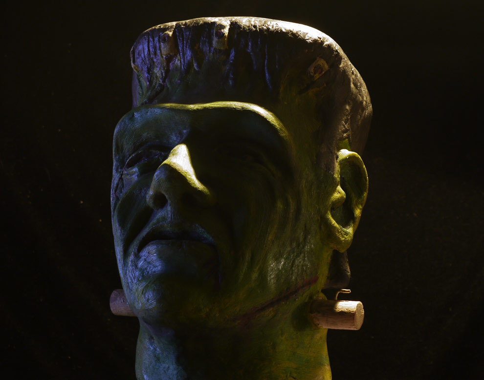 I had a book on marionettes and followed its instructions for making puppet heads. First, I sculpted the head out of clay. At that stage, it looked OK. Then, I made a plaster cast and pressed a shell of “Plastic Wood” into that. The book said to let it harden under water, using bbs to weigh it down. As it was so large, I used marbles, instead, and submerged it in the laundry sink. Then it began to shrink! When the head was finally dry, it was much smaller than expected, but still biger than mine. I glued the two halves together, affixed some electrodes made of dowel rods, and painted it with oil paints. Like the undying monster it depicted, the object that you see below somehow, survived the ravages of time..