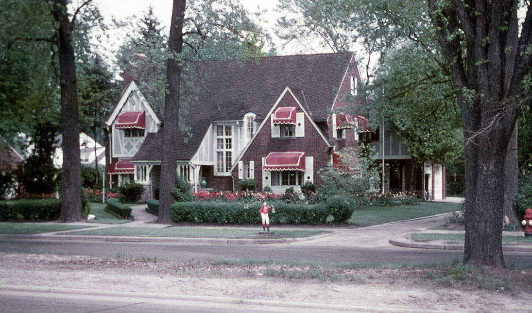 One night, a few years later, someone smashed the white-faced jockey to smithereens. My dad, undaunted, bought another. But, this time, he had “learned his lesson” and chose one that was Caucasian, in form, as well as color. It can be seen in this last photo. It even matched the newly added awnings.