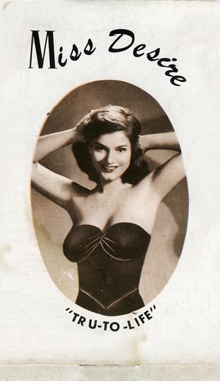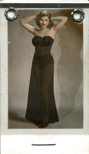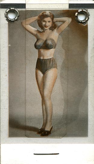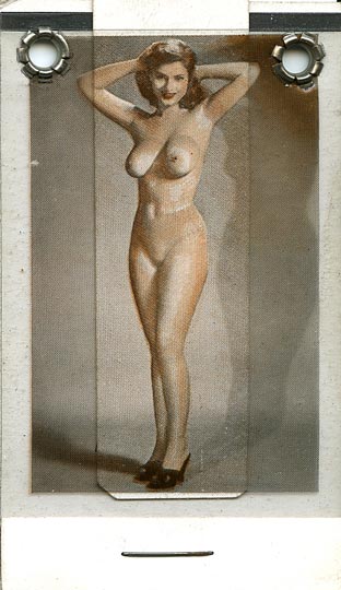 Miraculously, I actually got one of the most tantalizing items. This was a little folder with an inviting cover that showed a lady in a black negligee. Inside was a similar image, printed on two sheets of acetate. From staring at this item through the glass of the showcase, I could figure out that the black negligee was printed on the background. The first layer of acetate was printed with a bra and panties, and the top layer was the lady in the highly retouched altogether. When two small cards were inserted, the first covers the negligee, which disappears, the next obscures the bra and panties, and, Presto! There she is, as revealing as the airbrushed photos in a sunbathing magazine!