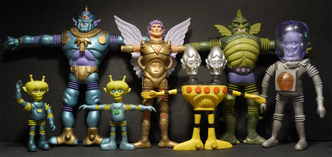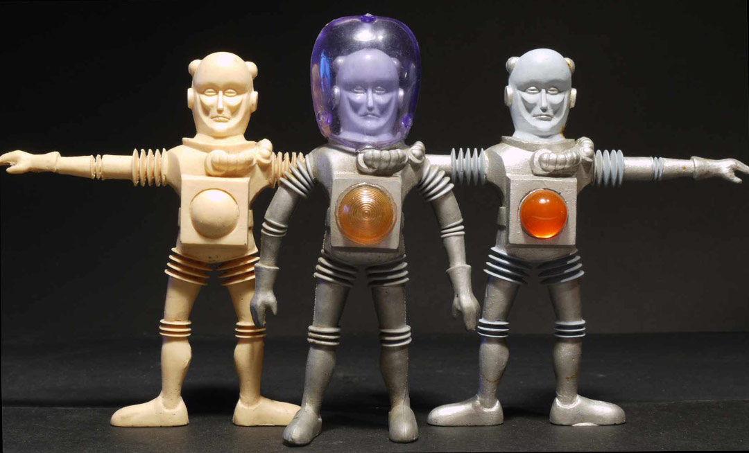 And here’s a final photo. The Horsemen asked for one that showed relative size. This is what I sent them. There is no hint or message in it. I have no idea what they may work on next. In that respect, your guess is as good as mine. But, nonetheless, we can but wonder, are these the Shapes of Things to Come? Hopefully, this photograph will whet your appetite for Outer Space Men.
