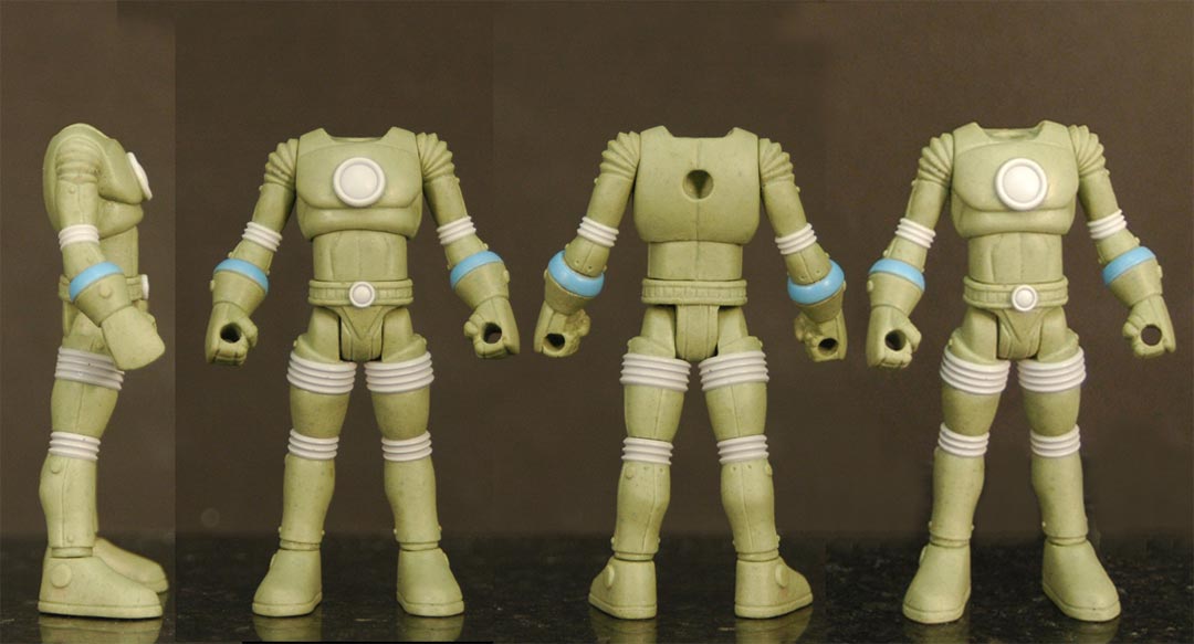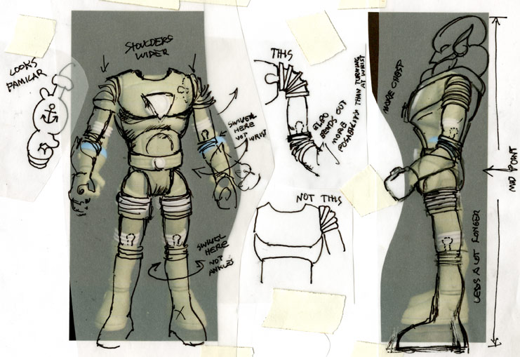 “Attached are some design drawings for 11 of the 13 OSM characters. These should help illustrate how some of the shared parts would work out amongst the various characters. As you can see there are quite a few unique bodies in the mix as well. Keep in mind that these were pretty quick drawings that were done more to illustrate how the body parts would work than for final styling. They will look similar to this, but a lot of the detail and visual flair will come out in the sculpting phase.”
