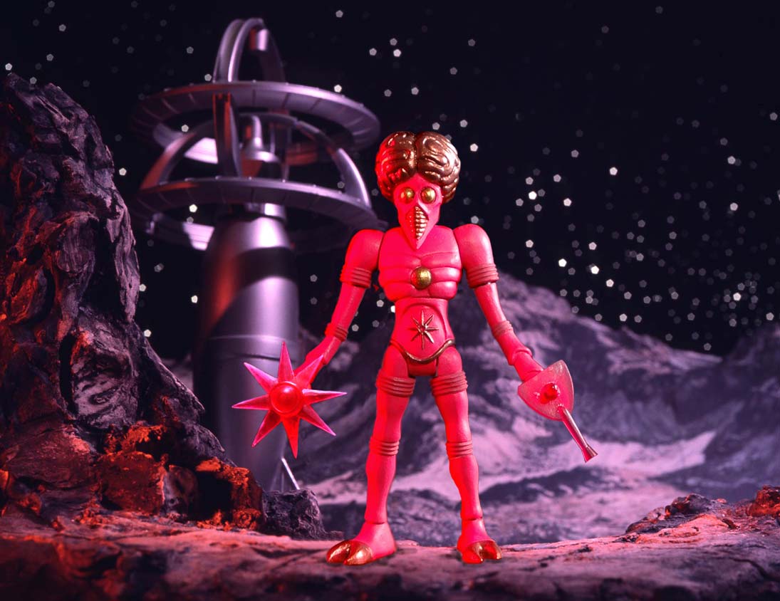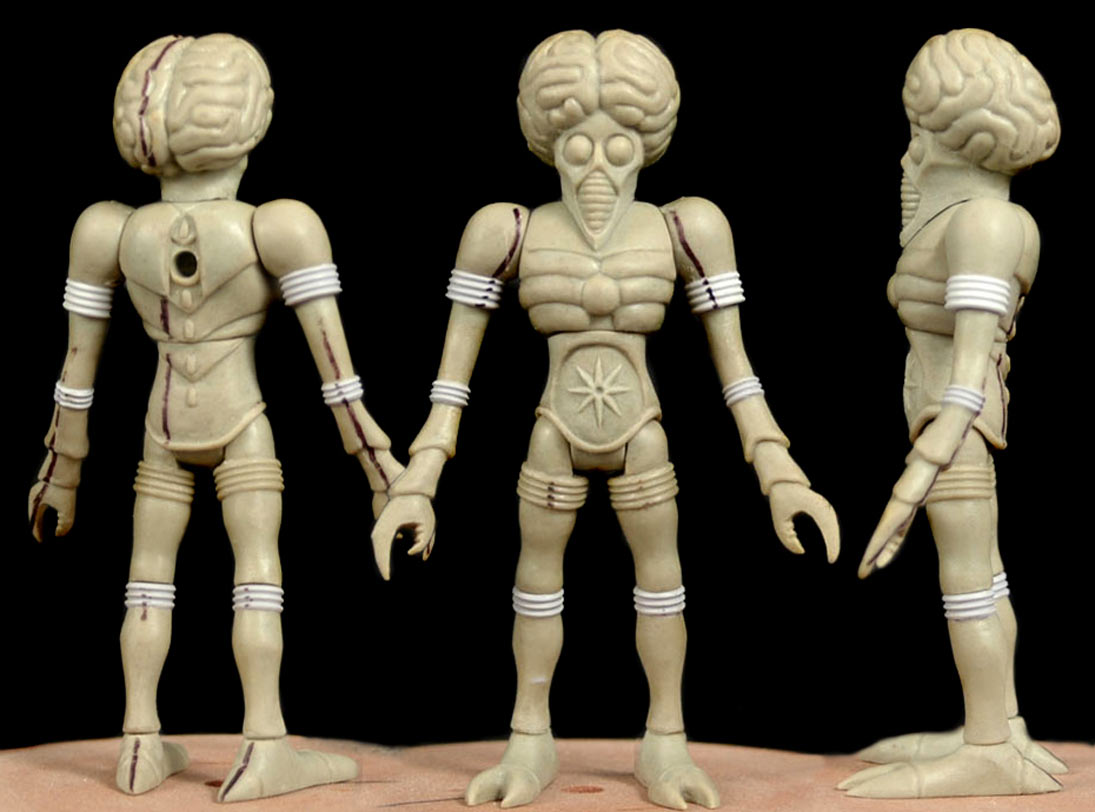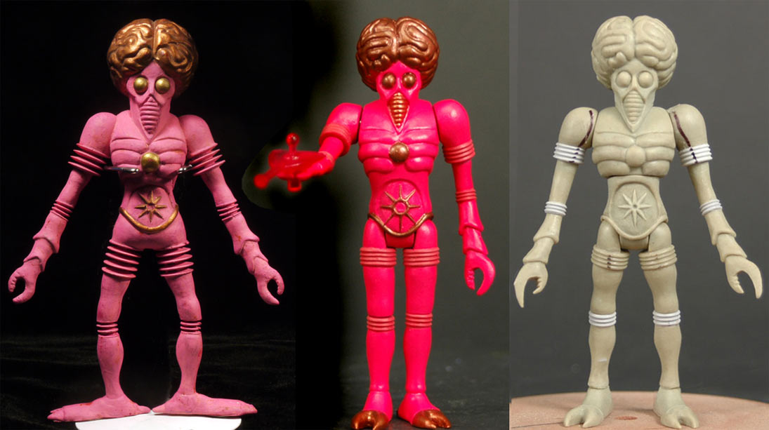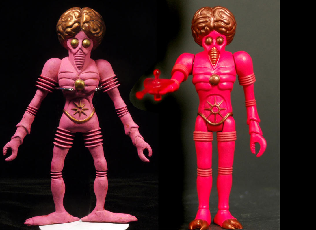 I mentioned some time ago that the Horsemen wanted to show a finished Colossus Rex at SDCC, which they did do to perfection! On the other hand, they just threw together a quick first sketch (in the middle) to represent Orbitron. This sketch was based on an actual production model of the bendable figure. But in production, Orbitron shrank and distorted considerably. Now the Horsemen have referred back to the original epoxy model of this figure (on the left) to bring you the best rendition possible. (on the right) And, WOW! Isn’t it Amazing? More Elegant in its simple form than what the public saw some 40 years ago.