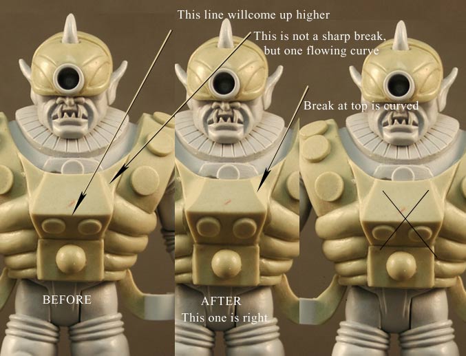 The overlay below shows the development under the arms. I realized in looking at the photos I shot for Eric that was the one area that didn't show up clearly. The sides of the pecks needed to be rounded and travel around the body, rather than being squared off. There is some squaring along the bottom edge, but it becomes rounded and voluptuous at the sides meeting right in the middle under the arms. This view also shows the feet thickened and the legs straightened up to match the Colossus angle, the collar has been thickened and the head raised and repositioned. Changes to the side of the head are indicated, but they are shown more clearly on the head close ups.