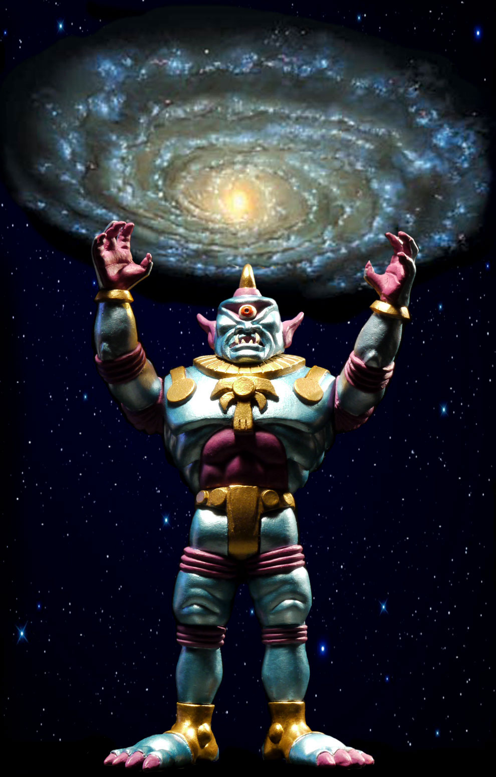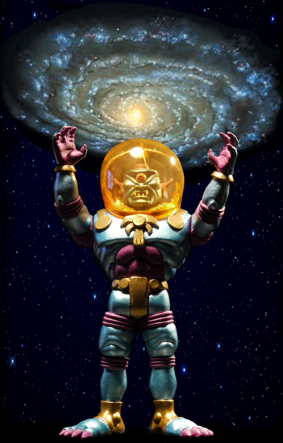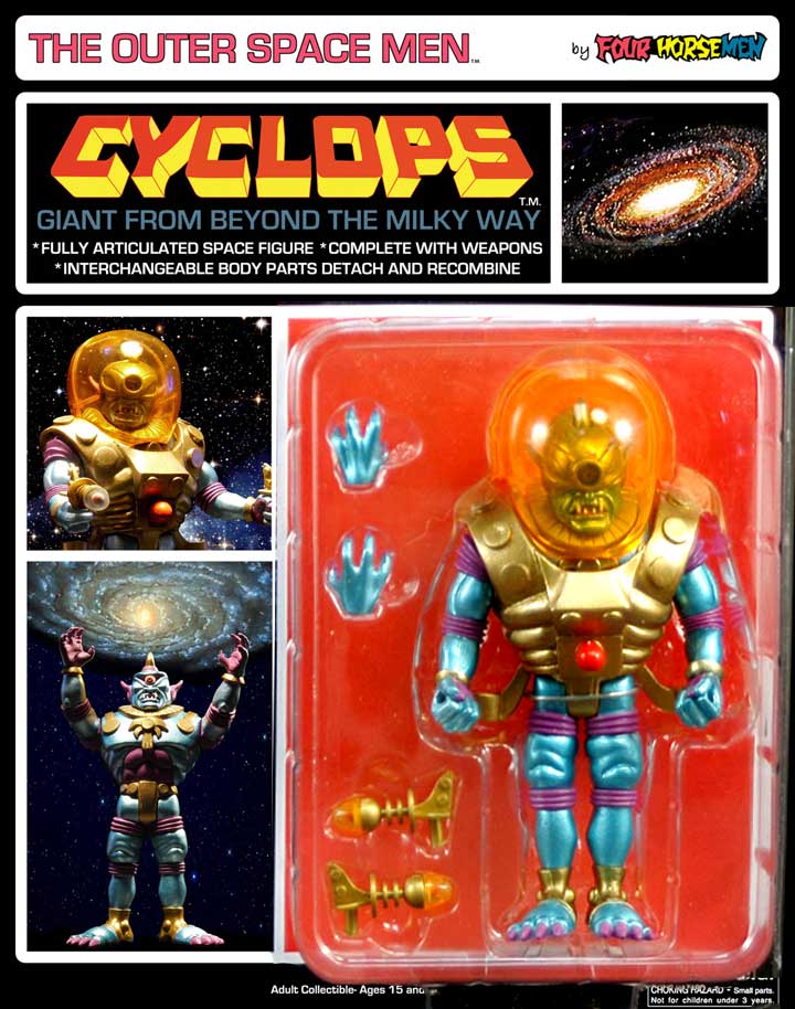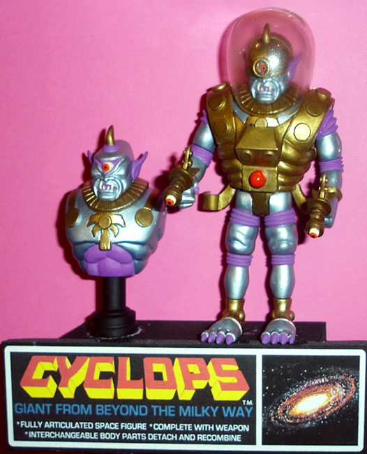 Beyond the stars and star smoke of our Milky Way! Out past the shining citadels of other Galaxies as numerous as stars! From a place so vast it cannot have a name, comes CYCLOPS, mighty intergalactic giant! Great Warrior of the Cosmos! In his forehead, the All-Seeing Eye; with it he can witness all that is happening anywhere in the Universe. In his belt, he carries two additional eyes. One can see the Past, the other, the Future. Gliding swiftly between the stars, through the darkest reaches of intergalactic space, he travels throughout eternity, forever seeking “more than meets the eye.”