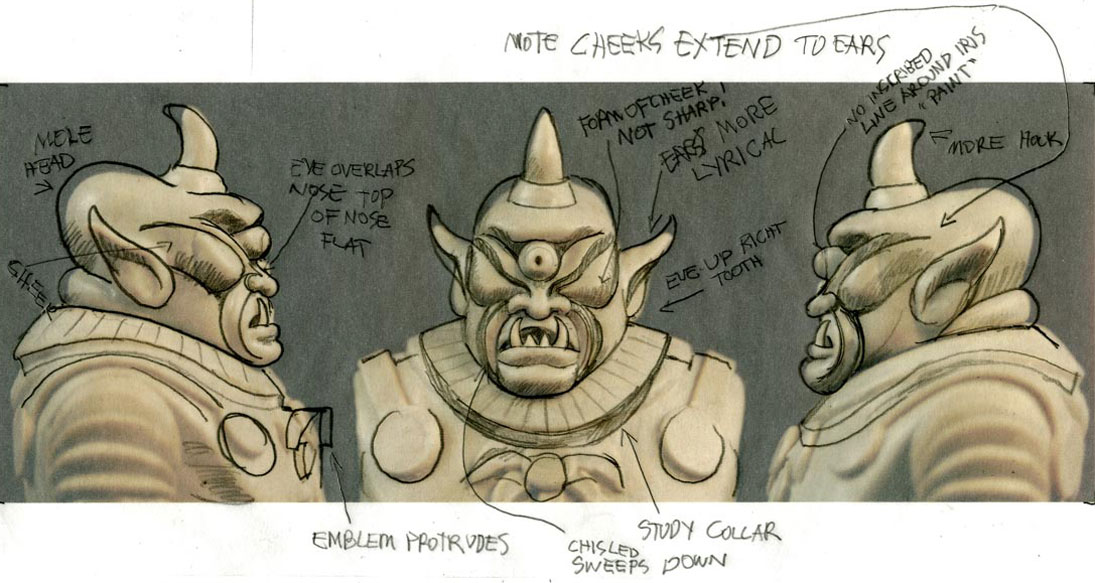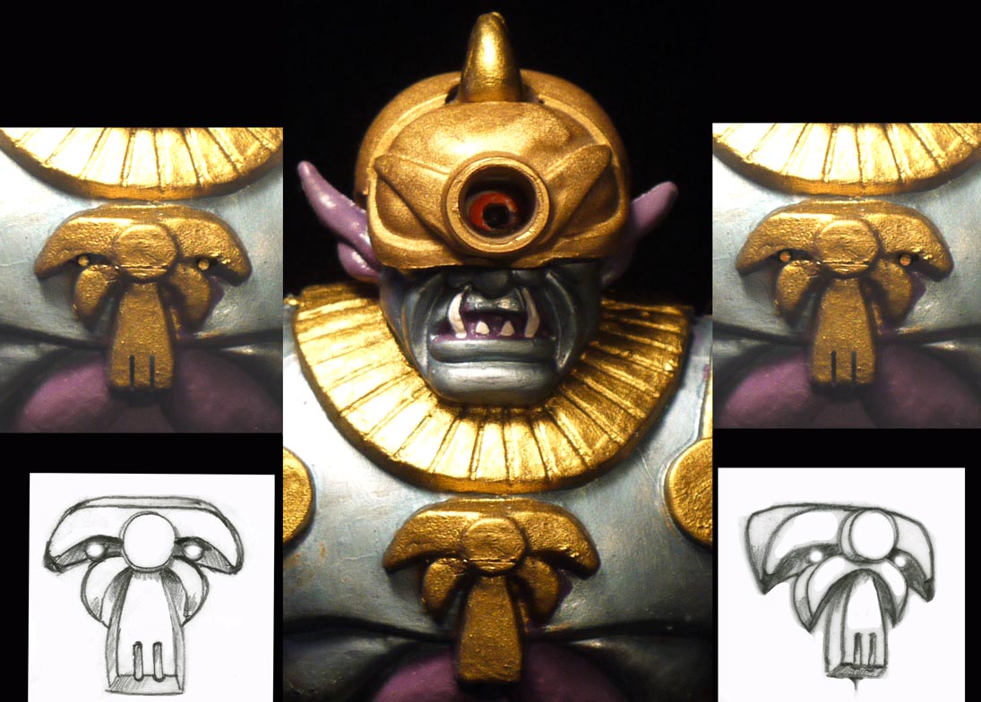 So, we agreed that to ask Eric to be aware of that, and subtly bring the image out. We went back and forth with sketches and discussion and both did drawings. I soon realized that they were unnecessary! In the end, I simply copied the photo of the emblem and in 2 minutes on Photoshop added two lines to represent the teeth and two dots to indicate small balls for eyes. Another solution was to just add the teeth lines and let the negative space and the shadow it creates, imply the eyes. Subtle and more secretive; the more I looked at it, the more I liked it best. It allows the viewer to see and experience what Matt saw. The teeth alone are all it needs. Eric agreed! To the uninitiated, this will just look like part of the 45 year old design, which, indeed, it is! But this really establishes a connection with Pheyden, originating somewhere, out there, beyond the Milky Way!