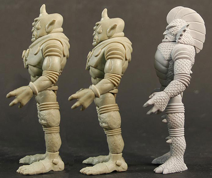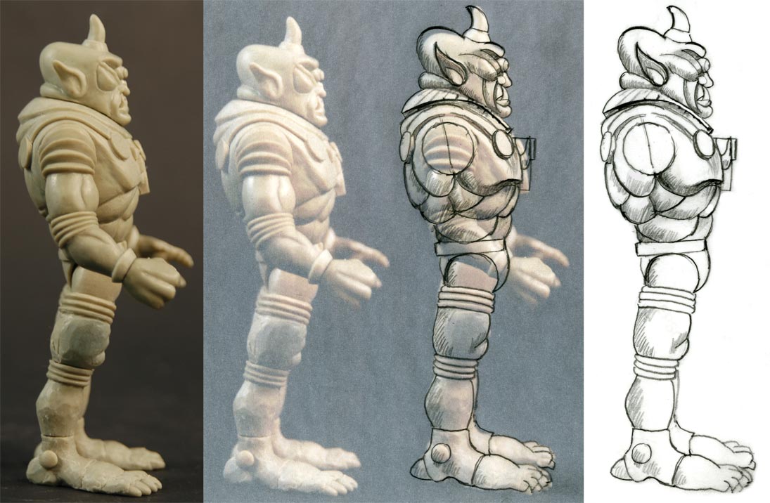 Eric did a Fantastic job on Cyclops. He captured his essence, coming right out of the gate. The visual material, and a thousand words (mercifully omitted here) called for very few changes. The photo, below, shows Eric’s original figure in the middle. I altered the figure on the left, using Photoshop. 1. The feet needed to be thicker. 2. The angle that the lower legs set into the feet should match that of Colossus Rex, on the far right. 3. The collar had to be thicker to grab the transparent dome. 4. The chest emblem was thickened, and the pectoral muscles rounded off to extend under his arms. These few alterations, using exactly the same pieces, resulted in a figure that appears larger.