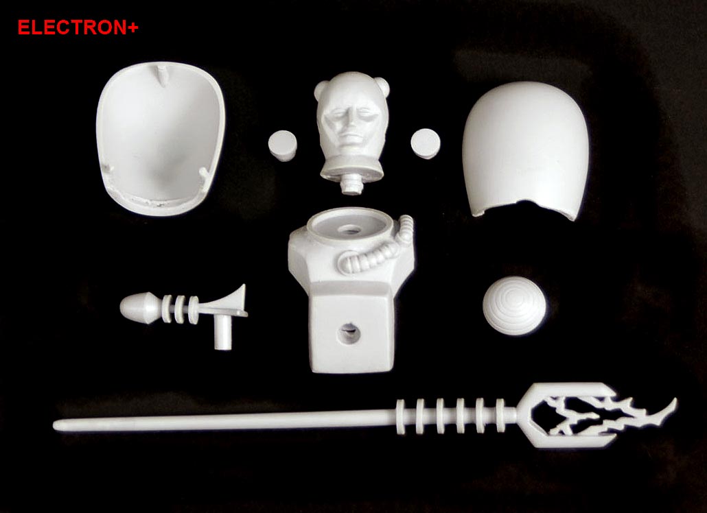 "You'll notice that there seems to be many parts missing from this Electron+'s tooling pattern when compared to the other figures in these two waves. That's because all of the parts that are missing from this image are parts that are shared with characters from Waves 1 and/or 2. That means that those parts have already been tooled, and we don't need to include those in the new tooling pattern. The two ear discs on the sides of his head will be separate and removable as seen in the image, but the two domed plugs near the top of his head had to be solidified onto the head because of tooling costs. Once Electron+ is a complete figure, he'll have a total of 22 parts."