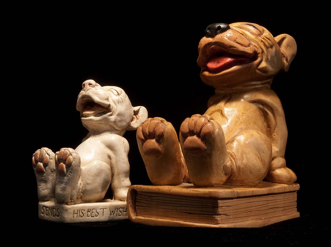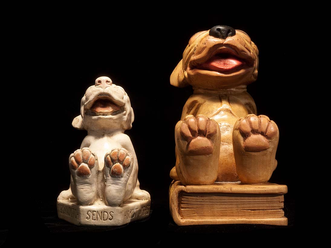 The plaster statue of Bonzo on the left, is about as iconic an image of Bonzo as one can get. It appears to have been produced in conjunction with his appearances in the “Sketch.” Around the base it reads, “BONZO of The SKETCH SENDS HIS BEST WISHES”. On the back, it is “signed” “G. E. STUDDY.” This is an early piece, rendered in Studdy’s more realistic doggy style. Later on, Bonzo took on a rounder cuter more comic look. There is very subtle toning and tinting on the figure. It has been suggested that this might be a bookend. I tend to question that, as the side view reveals that the the 90 degree perpendicular, required to hold a book upright, is not flat.