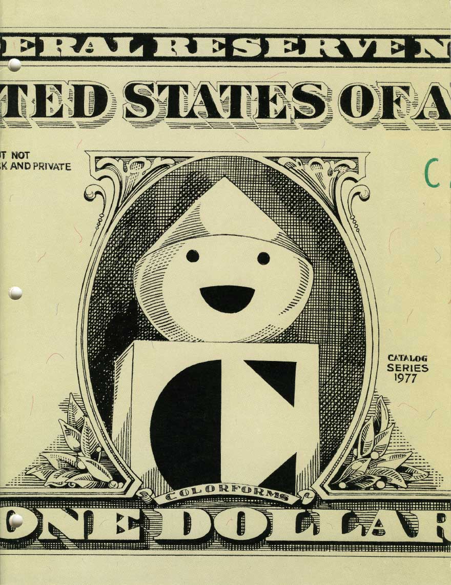 Why an over-sized dollar bill appeared to be appropriate for the catalogue cover in 1977, escapes my memory today. But it must have seemed like a good idea at the time. Maybe because Colorforms was making money, or just because a dollar bill was fun to draw. The president’s signature was Harry’s, and the treasurer’s was that of Colorform’s comptroller, Henry Friedman. Even the little colored hairs embedded in the paper were there. The cover FOLDED OUT to reveal the entire dollar.